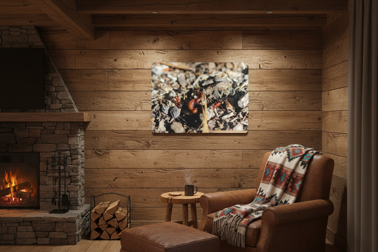 This metal art sign brings a quiet, grounded moment from the forest floor into your home. The close-up photograph of soil, pebbles and a tiny curled seed or larva is printed in full color on a matte white aluminum composite panel, giving the natural textures a soft, tactile quality. It feels like kneeling down to inspect a trail — small wonders made visible. Lightweight yet sturdy, the sign hangs cleanly on the wall and works as a subtle focal point in a mudroom, entryway, nature-themed studio, or beside a collection of plant pots. Assembly is simple: affix the included mounting block and press the plate in place to display that accidental, intimate patch of earth that invites slow looks and quiet conversations.