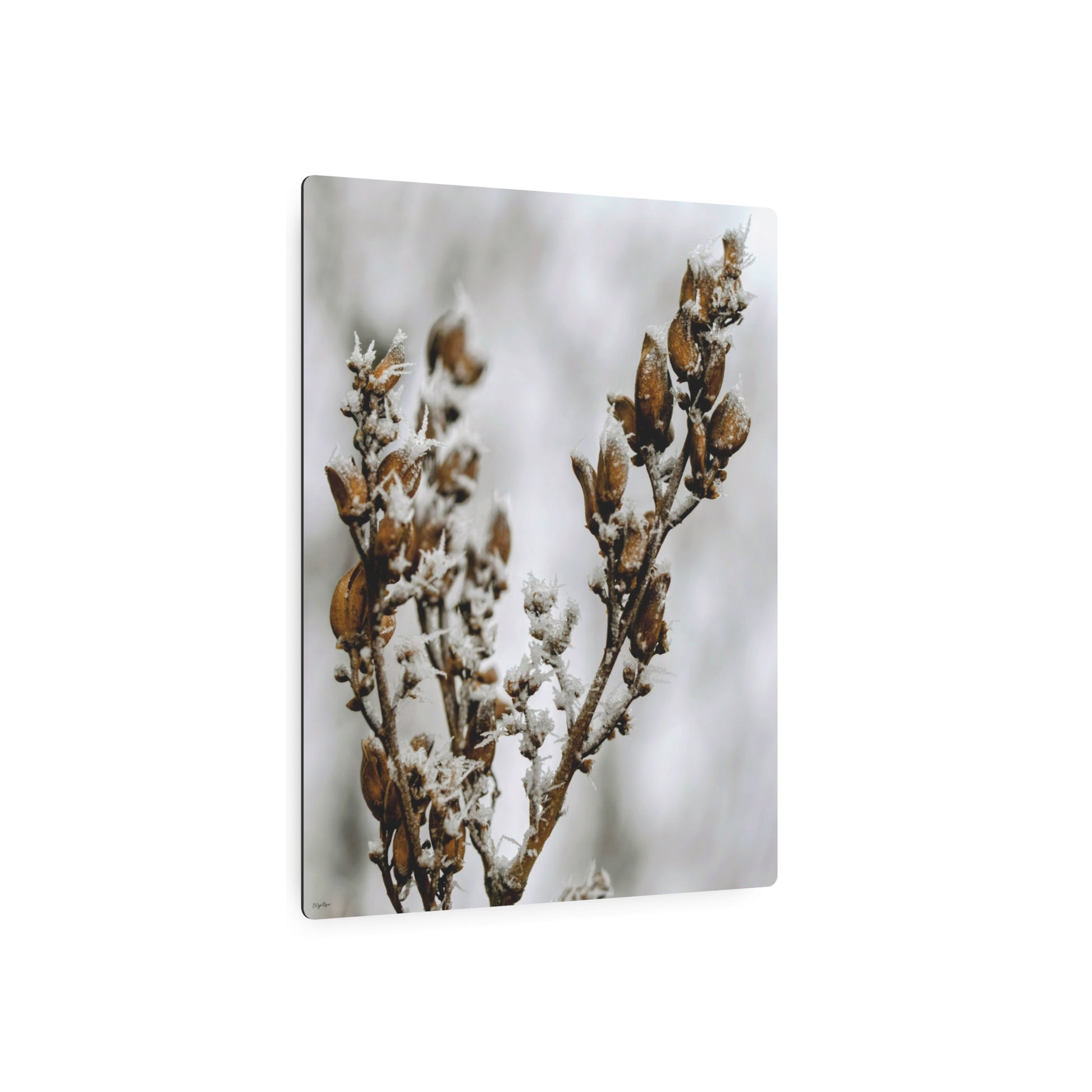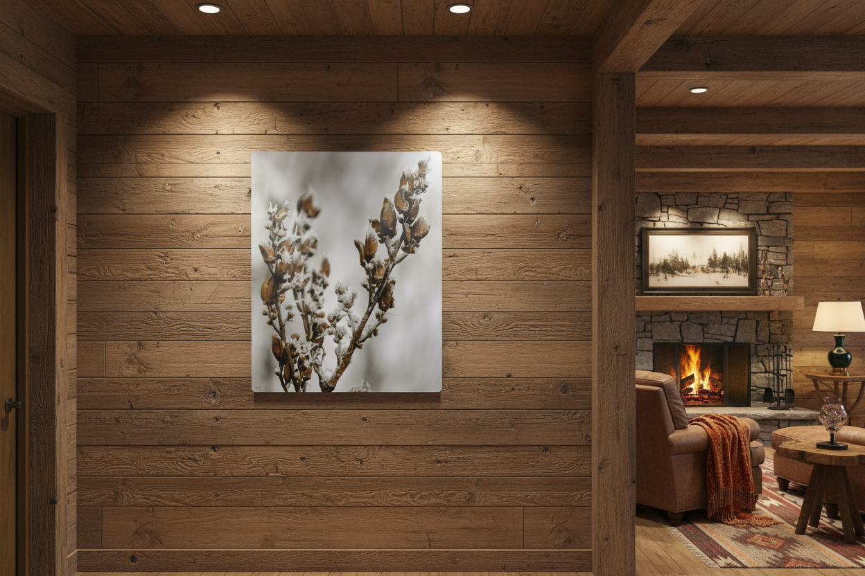 Thin, frosted petals of lilac frozen mid-bloom — this metal sign brings that quiet, cold beauty indoors. Pale ice-crystal patterns catch the light across a soft matte surface, like a winter morning lingering on a garden. It hangs easily on a wall or tucked into a cozy corner, adding a subtle, contemplative mood to a room. For someone who notices small seasonal moments, this sign reads like a memory: fragile, cool, and oddly comforting. It works with muted palettes, dried bouquets, or layered with other botanical pieces to create a calm vignette for housewarmings, winter gatherings, or slow evenings by the window.