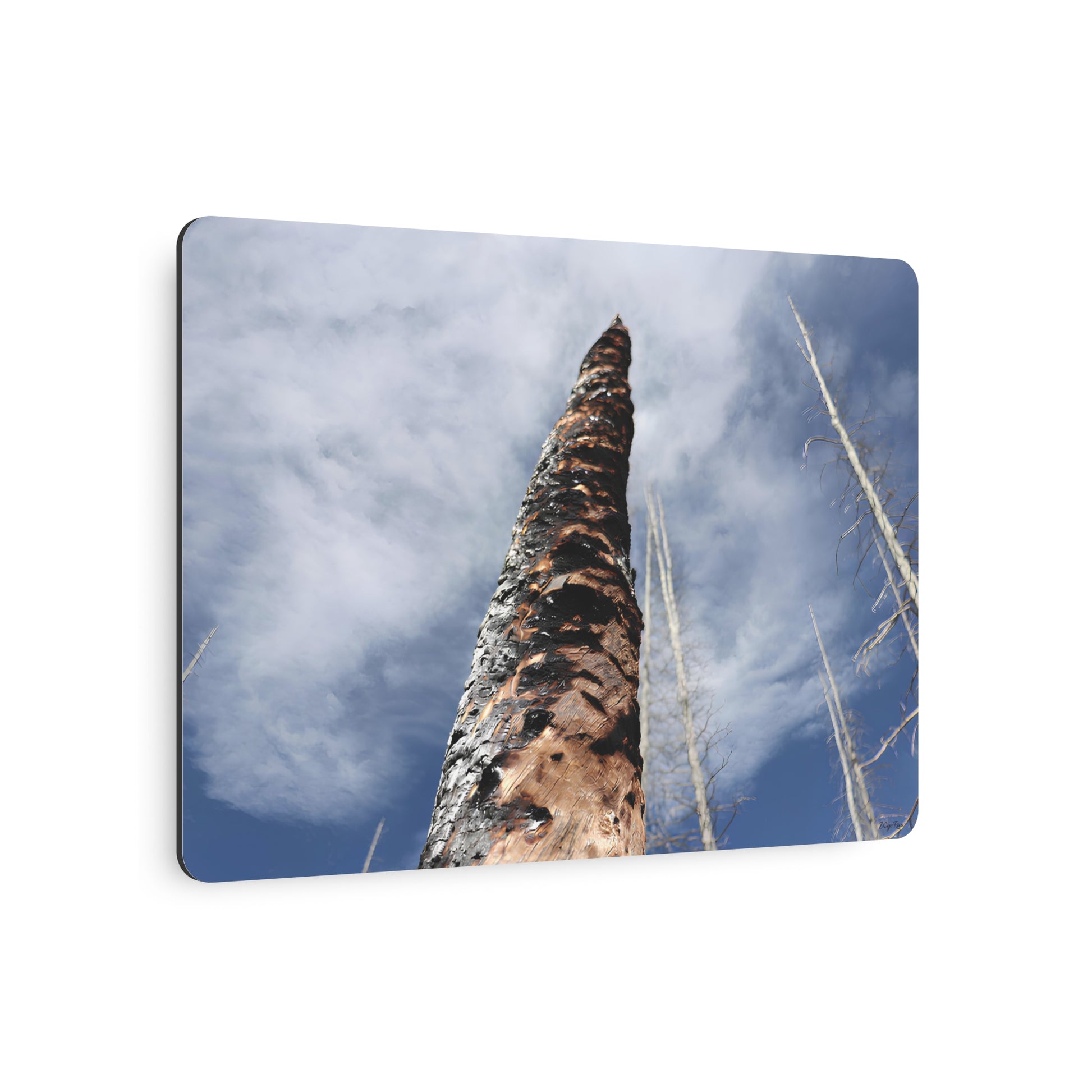A striking metal wall sign that captures a moment beneath towering, scorched, weathered trees — the camera angled upward toward a pale blue sky streaked with clouds. Printed in full color on lightweight white aluminum with a soft matte finish, the image brings outdoor texture and atmosphere into an indoor space without the weight of traditional framed art. The rounded corners and choice of horizontal, vertical, or square orientations let this piece sit naturally on a gallery wall, entryway, or reading nook. Each sign arrives with a discrete mounting block and double-sided tape so you can position it quickly; a simple, minimal assembly step secures the plate flush to the wall. This piece suits lovers of slow walks in burned forests, photographers who treasure raw landscapes, and anyone who wants a quiet, contemplative snapshot of the sky and trees to anchor their room.