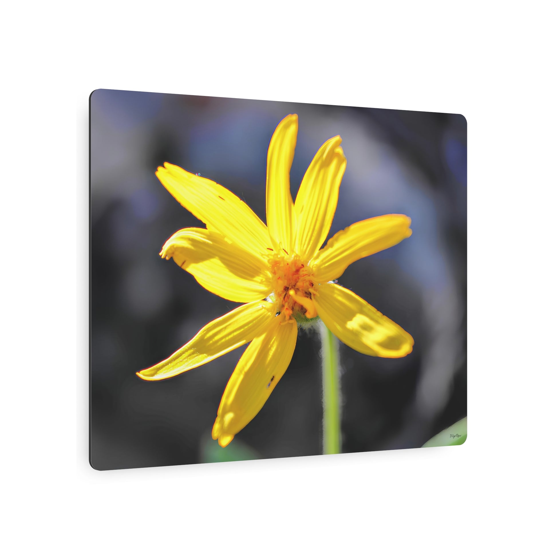 A bright, close-up photograph of a single yellow wildflower printed on lightweight white aluminum. The matte finish softens glare and brings a painterly quality to the image, letting the delicate petals and subtle background blur stand out on a modern metal panel. Mount it in a sunny kitchen, a cozy reading nook, or an entryway where botanical warmth is welcome. The sign’s slim profile and clean edges lend a contemporary touch while the floral subject keeps the mood gentle and uplifting. Assembly is simple — a mounting block and tape are included so you can position it horizontally, vertically, or square to suit your wall and space.